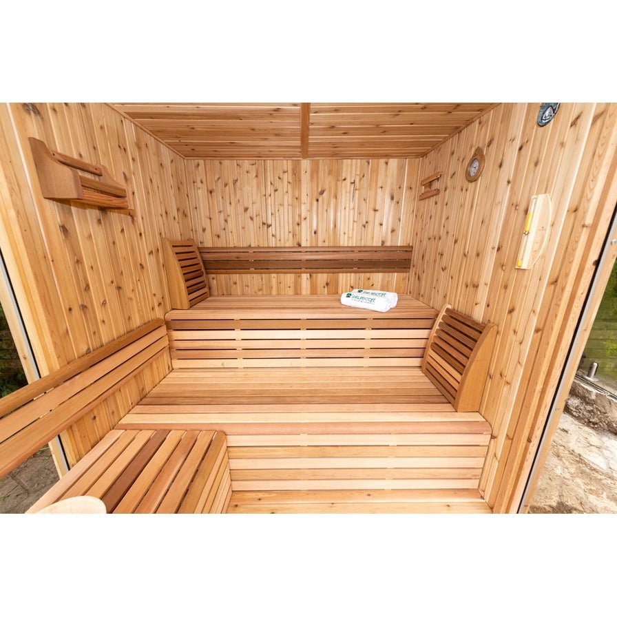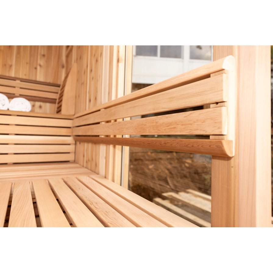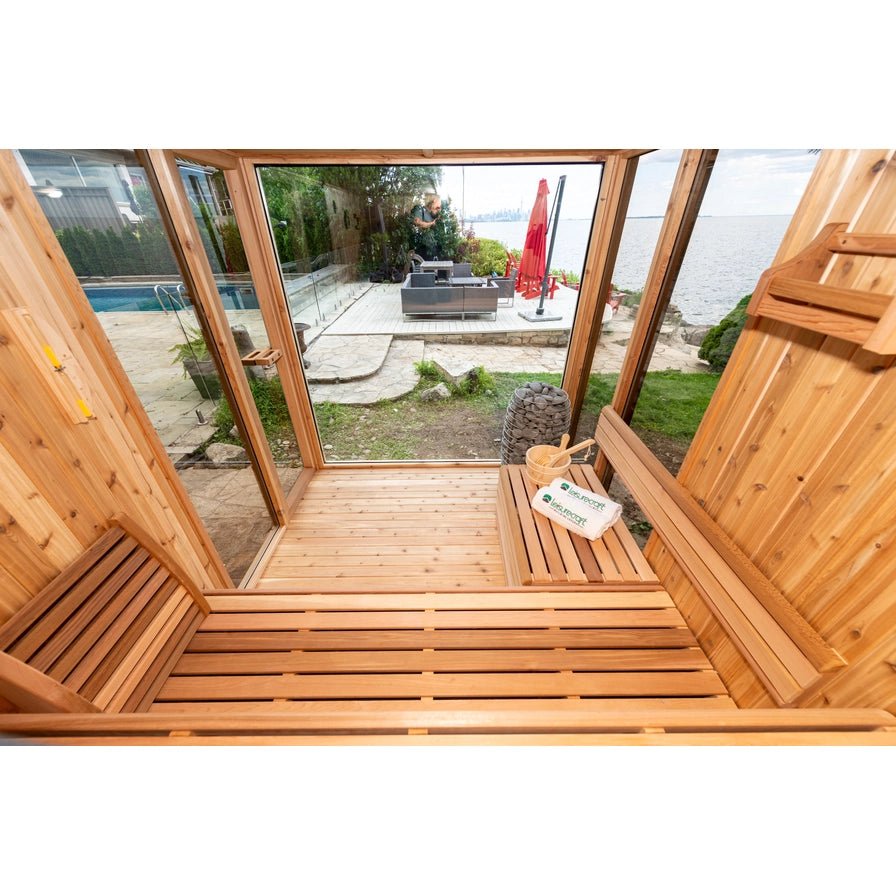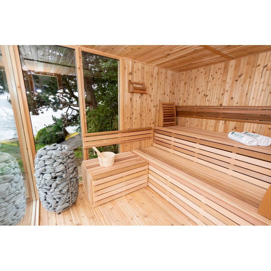 Embrace a sauna experience that transcends the ordinary with the Pure Cube Orion Sauna. Available in both Knotty Red Cedar and Clear Red Cedar, this innovative Leisurecraft Sauna combines the warmth of traditional sauna bathing with the breathtaking views afforded by 180-degree bronze tempered glass units. Perfect for those who wish to merge the serenity of nature with the rejuvenating power of sauna therapy, the Orion Sauna ensures you can enjoy your surroundings without stepping outside.