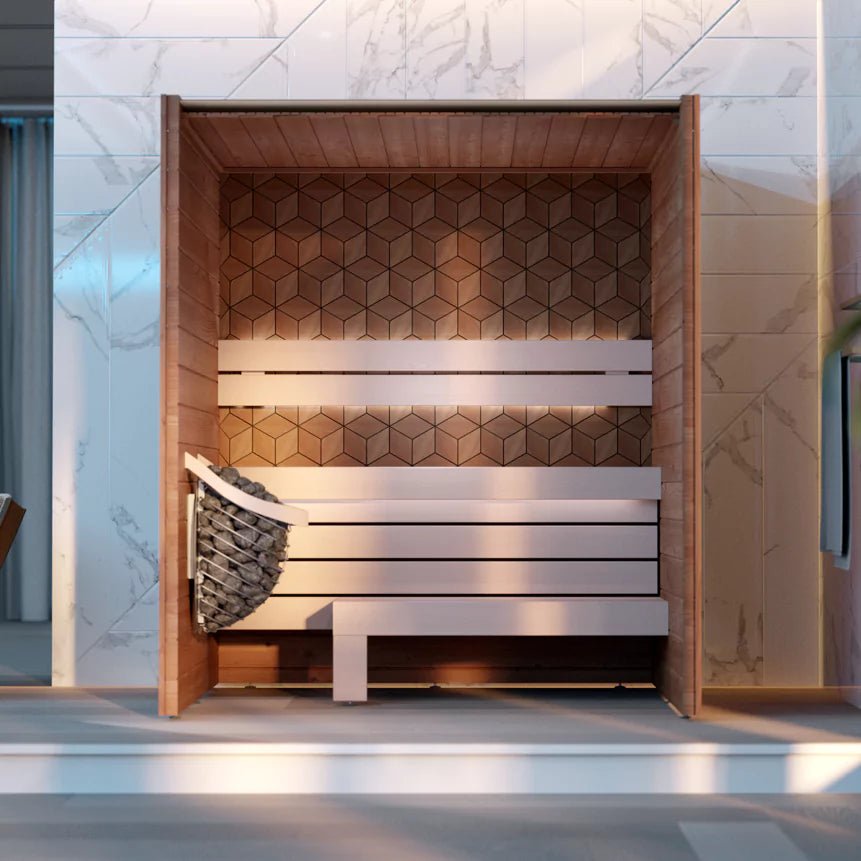 The Heritage Lux Lugano is the largest single-bench sauna in the series, offering generous space for three people. With a deep layout and Aspen 2-step bench mounted along the back wall, it creates an open and relaxing atmosphere. The front left heater position allows for maximum legroom, while the optional hexagon back panel and LED lighting add a premium aesthetic. The sauna measures 51.6 × 71.3 × 81.9 inches, delivering 24.8 ft² of area and a spacious 141.3 ft³ interior. This is a versatile choice for small families or home spas.