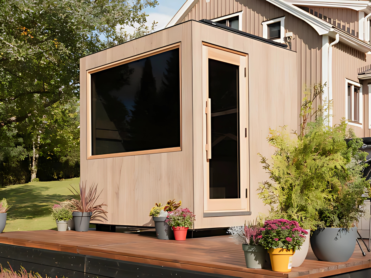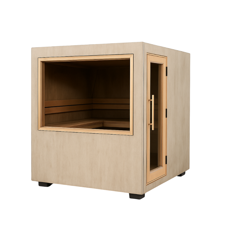 Available in Small (2–3 person) and Medium (4–5 person) sizes, Solaris fits beautifully in outdoor settings like backyards, patios, or lakeside getaways. Featuring a solar-tinted panoramic glass wall, durable tile cladding, and a compact Harvia heater, it’s both elegant and built to last. Each unit ships fully assembled with integrated solar panels, battery packs, and the Xenio CX170 digital control system for a seamless experience.